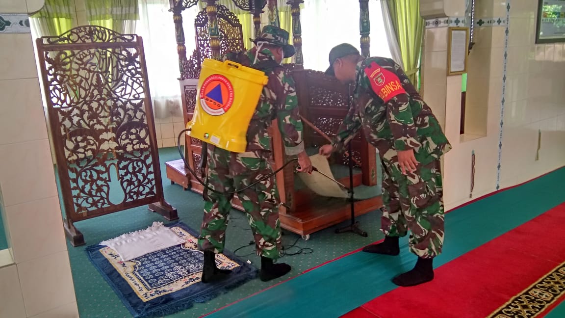BARABAI – Gugus Tugas Covid-19, TNI-Polri dan Stake Holder HST melaksanakan pencegahan meluasnya penyebaran virus corona (Covid-19) dengan penyemprotan disifektan tempat-tempat ibadah, Selasa (24/3/2020).