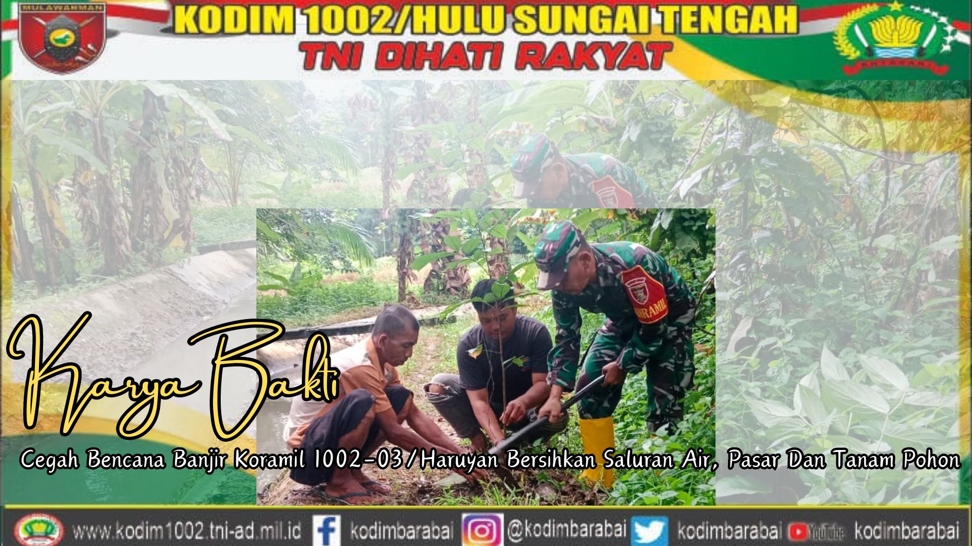 BARABAI-Karya Bhakti dalam rangka mengantisipasi Banjir dan munculnya wabah penyakit DBD Koramil 1002-03/Haruyan Kodim 1002/HST, membersihkan saluran air, Pasar dan Tanam Pohon di desa Barikin Kecamatan Haruyan Kab. Hulu Sungai Tengah. Rabu (17/01/2024)