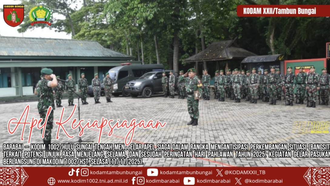 Apel kesiapsiagaan tersebut dipimpin langsung oleh Dandim 1002/HST Letkol Inf Ardiansyah Okta Putra Siregar S.I.P, dan diikuti oleh seluruh personel jajaran Kodim 1002/HST.