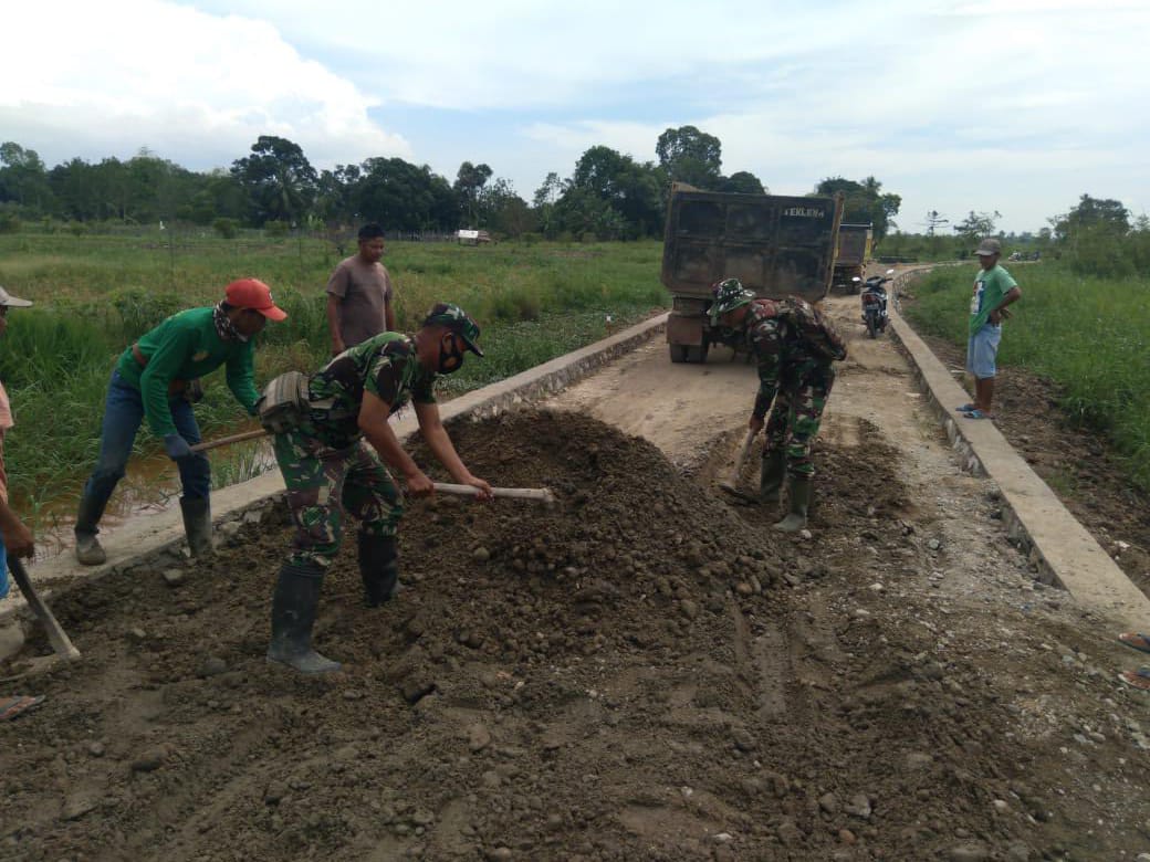 Bersama warga masyarakat anggota Kodim 1002/HST mengahampar material sirtu sasaran utama perbaikan mutu jalan sepanjang 1725 meter dalam rangka kegiatan TMMD ke-112 tahun 2021.