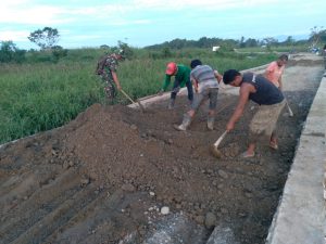 BARABAI-Sempat terkendala cuaca (Hujan) akhirnya material sirtu (Pasir Batu) langsung dihampar di lokasi Pra TMMD ke-112 tahun 2021 Kodim 1002/HST di desa Rantau Keminting Kec.Labuan Amas Utara Kab.Hulu Sungai Tengah setelah cuaca panas. Jum’at (10/09/2021) sore