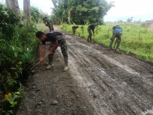 HULU SUNGAI TENGAH-Meski kondisi cuaca tidak mendukung, tak mengurangi semangat anggota Satgas TMMD ke 112 Kodim 1002/Hulu Sungai Tengah (HST) untuk bekerja melanjutkan perbaikan mutu jalan sepanjang 1.725 meter yang mana pengerjaan tersebut telah dimulai pada 2 pekan terakhir dalam program TMMD.