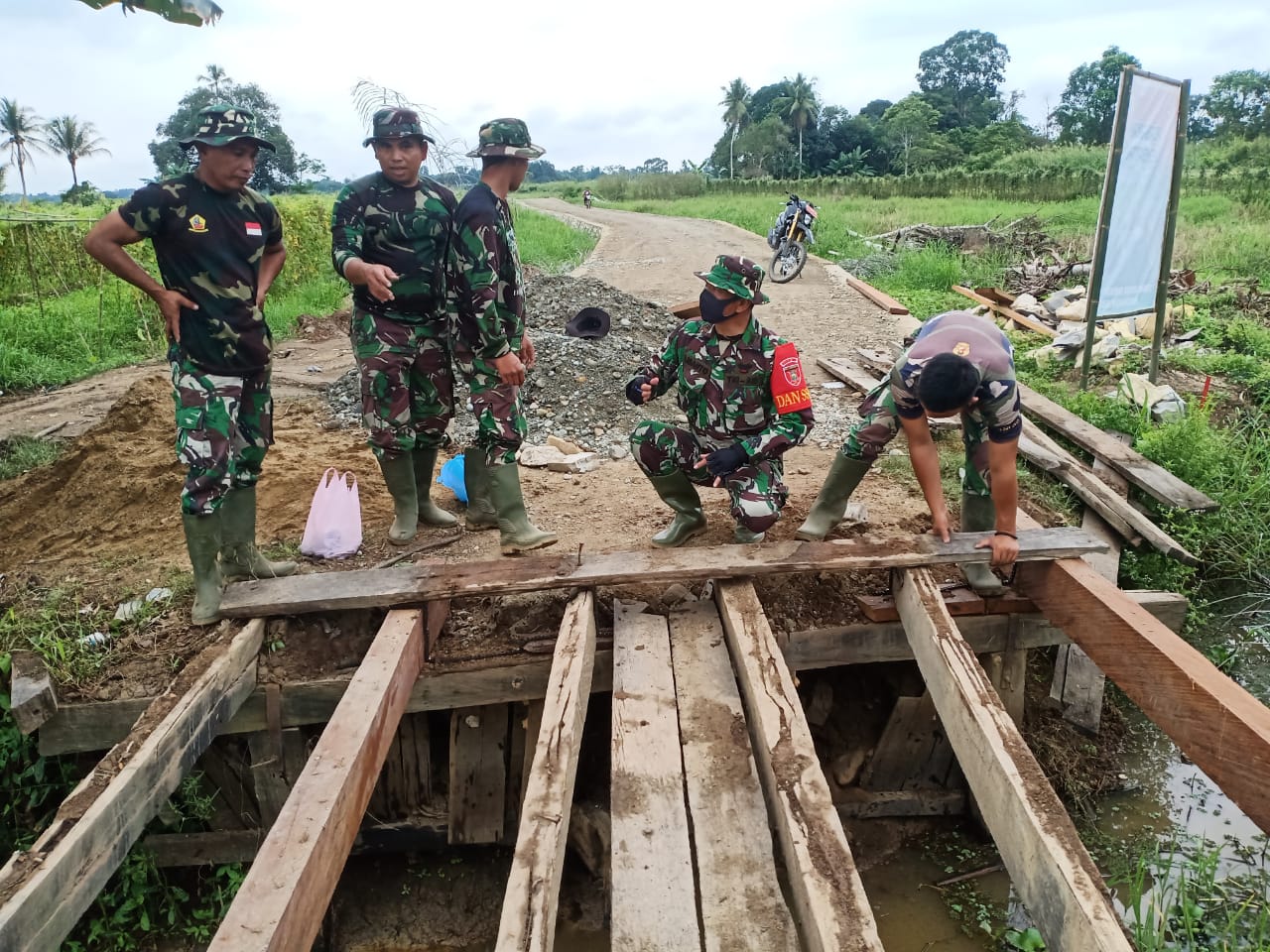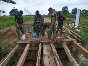Terlihat di lokasi, Kapten Lilis memberikan arahan pada pengerjaan pembuatan jembatan berukuran 8×3,5 meter dengan material utama berupa kayu ulin.