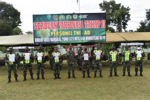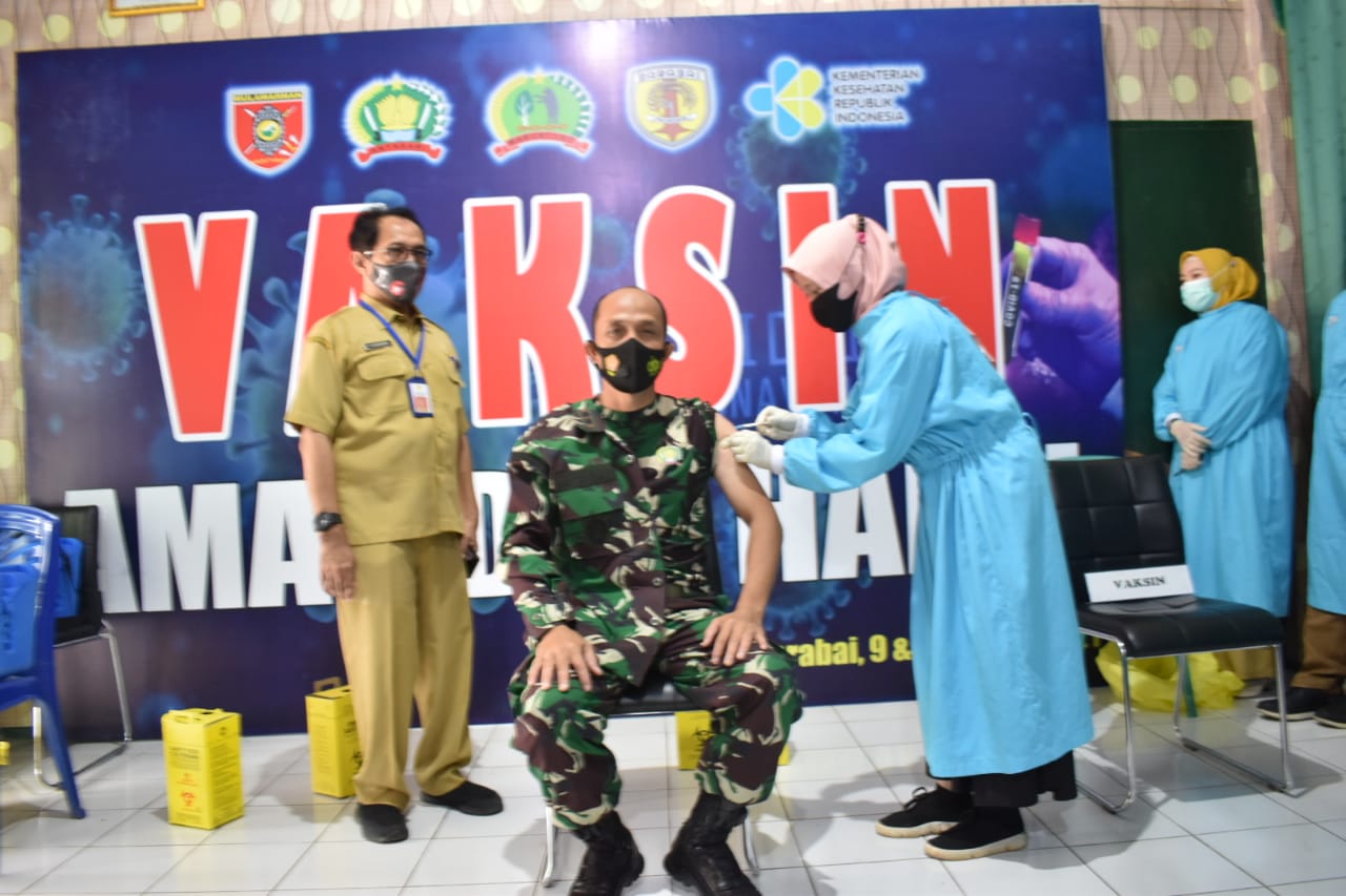 BARABAI-Seluruh anggota Kodim 1002/Barabai dan anggota Yonif 621/Manuntung, Minvetcad VI/10 Barabai dan Poskes 06.10.09/Barabai mengikuti kegiatan serbuan vaksinasi tahap II yang digelar di ruang Data Makodim Jalan Telaga Padawangan Kelurahan Barabai Timur Kecamatan Barabai Kabupaten Hulu Sungai Tengah (HST).Selasa (09/03/2021).