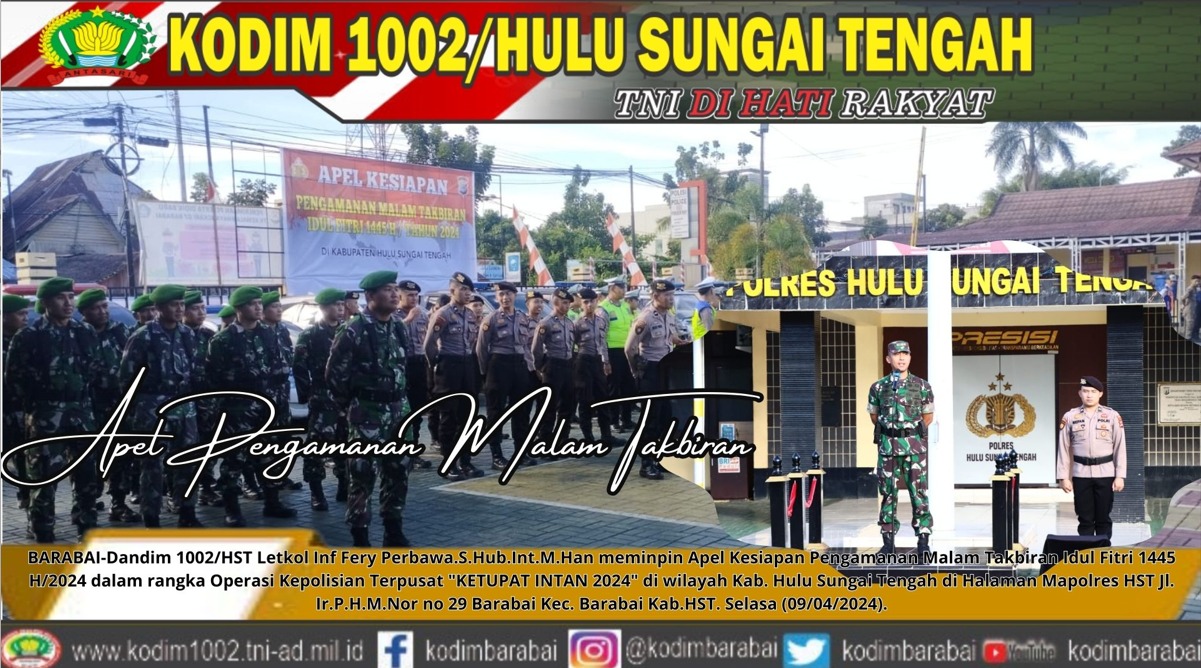 BARABAI-Dandim 1002/HST Letkol Inf Fery Perbawa.S.Hub.Int.M.Han meminpin Apel Kesiapan Pengamanan Malam Takbiran Idul Fitri 1445 H/2024 dalam rangka Operasi Kepolisian Terpusat “KETUPAT INTAN 2024” di wilayah Kab. Hulu Sungai Tengah di Halaman Mapolres HST Jl. Ir.P.H.M.Nor no 29 Barabai Kec. Barabai Kab.HST. Selasa (09/04/2024).