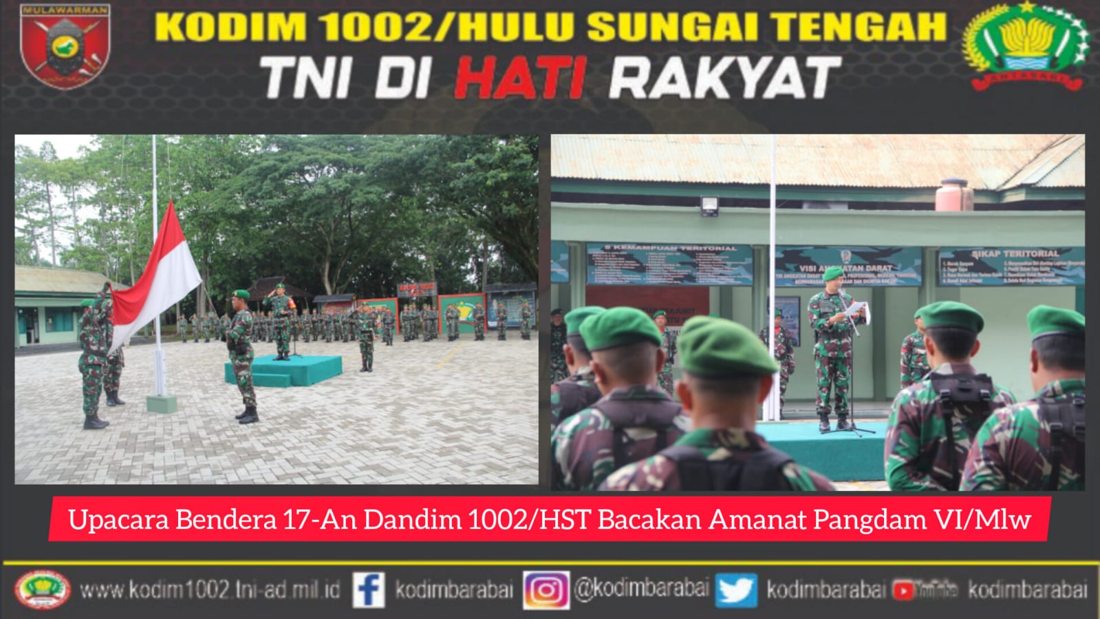 Dalam amanat Pangdam VI/Mulawarman yang dibacakan inspektur Upacara, terdapat penekanan kepada Komandan Satuan dan Kabalak agar selalu meningkatkan kepedulian dan melakukan pengawasan melekat serta pengendalian kepada seluruh anggotanya baik di dalam jam dinas maupun diluar jam dinas, selalu mengotimalkan kegiatan Jam Komandan serta laksanakan pembinaan mental secara rutin dan berkesinambungan kepada seluruh anggota di satuan,