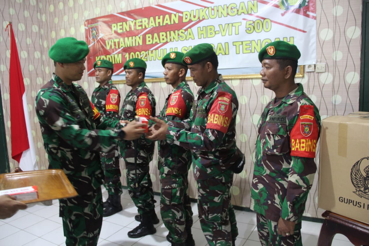 BARABAI-Komandan Kodim 1002/Hulu Sungai Tengah Letkol Kav Gagang Prawardhana.S.I.P.,M.Han membagikan vitamin HB-VIT 500 dari Kepala Staf Angkatan Darat (KASAD) secara simbolis kepada Danramil dan Babinsa.