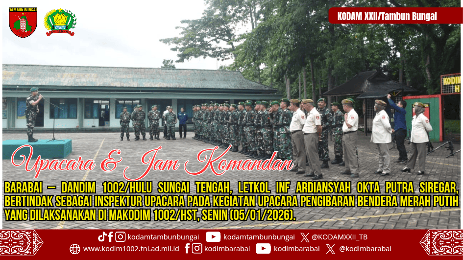 BARABAI – Dandim 1002/Hulu Sungai Tengah, Letkol Inf Ardiansyah Okta Putra Siregar, bertindak sebagai Inspektur Upacara pada kegiatan upacara pengibaran Bendera Merah Putih yang dilaksanakan di Makodim 1002/HST, Senin (05/01/2026).
