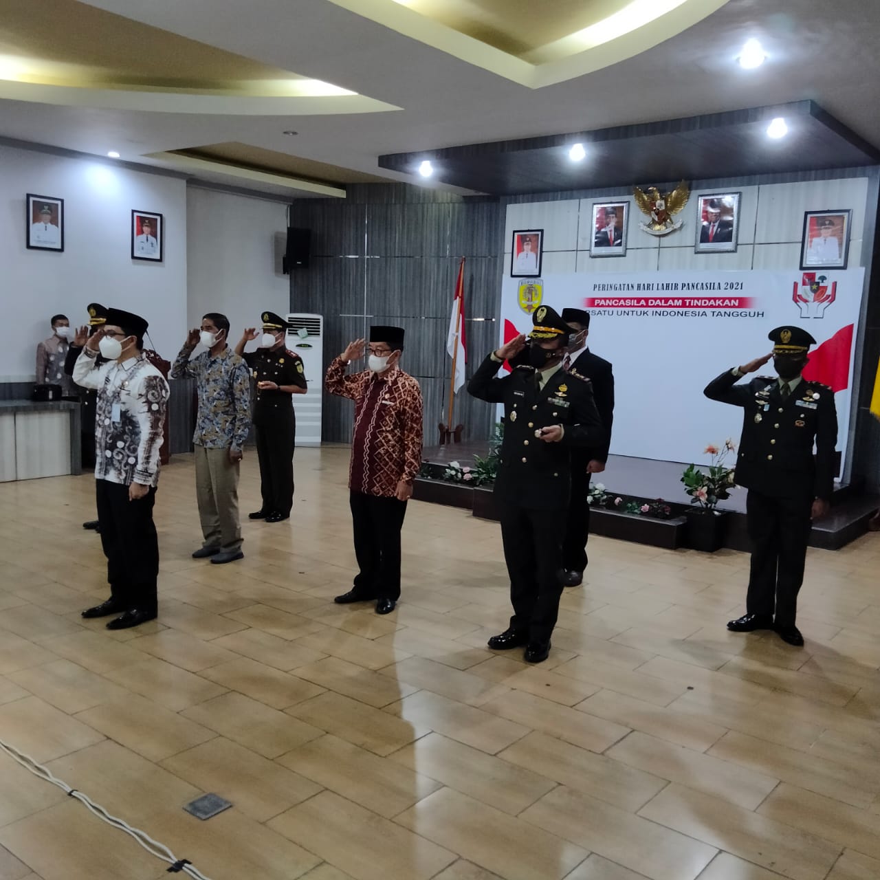 BARABAI-Dandim 1002/Hulu Sungai Tengah Letkol Inf Muh Ishak HmBahsruddin.S.I.P.,M.I.,Pol bersama Bupati HST dan Forkompinda mengikuti Upacara Hari Lahir Pancasila Secara Virtual/Vicon (Video Converence) bertempat di Auditorium kantor Bupati HST Jl. Perwira nomor 02. Kec. Barabai Kab. Hulu Sungai Tengah (HST), dengan tema “Pancasila Dalam Tindakan Bersatu Untuk Indonesia Tangguh”.Selasa (01/06).