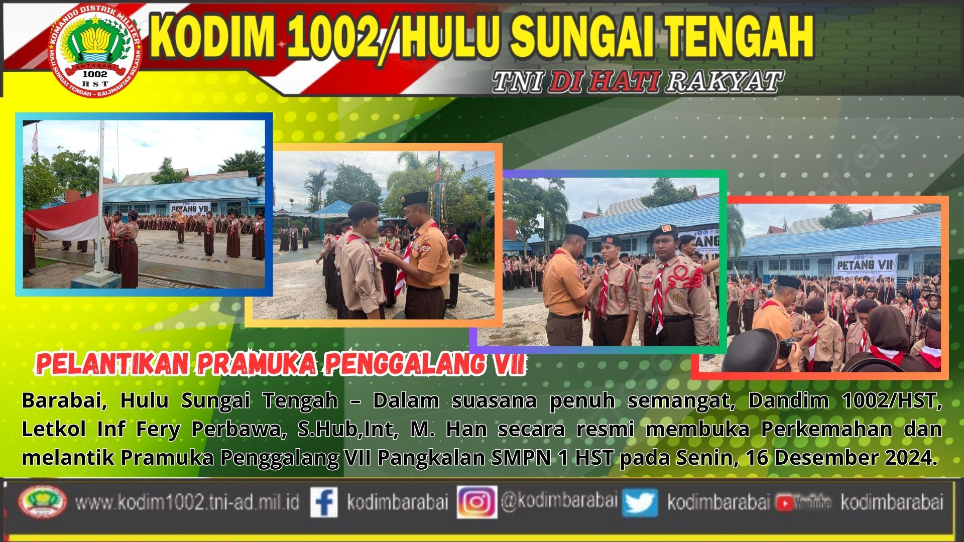 Barabai, Hulu Sungai Tengah – Dalam upaya mencetak generasi muda yang berkualitas dan berkarakter, Dandim 1002/HST, Letkol Inf Fery Perbawa, S.Hub,Int, M. Han secara langsung memimpin pelantikan Pramuka Penggalang VII Pangkalan SMPN 1 HST.