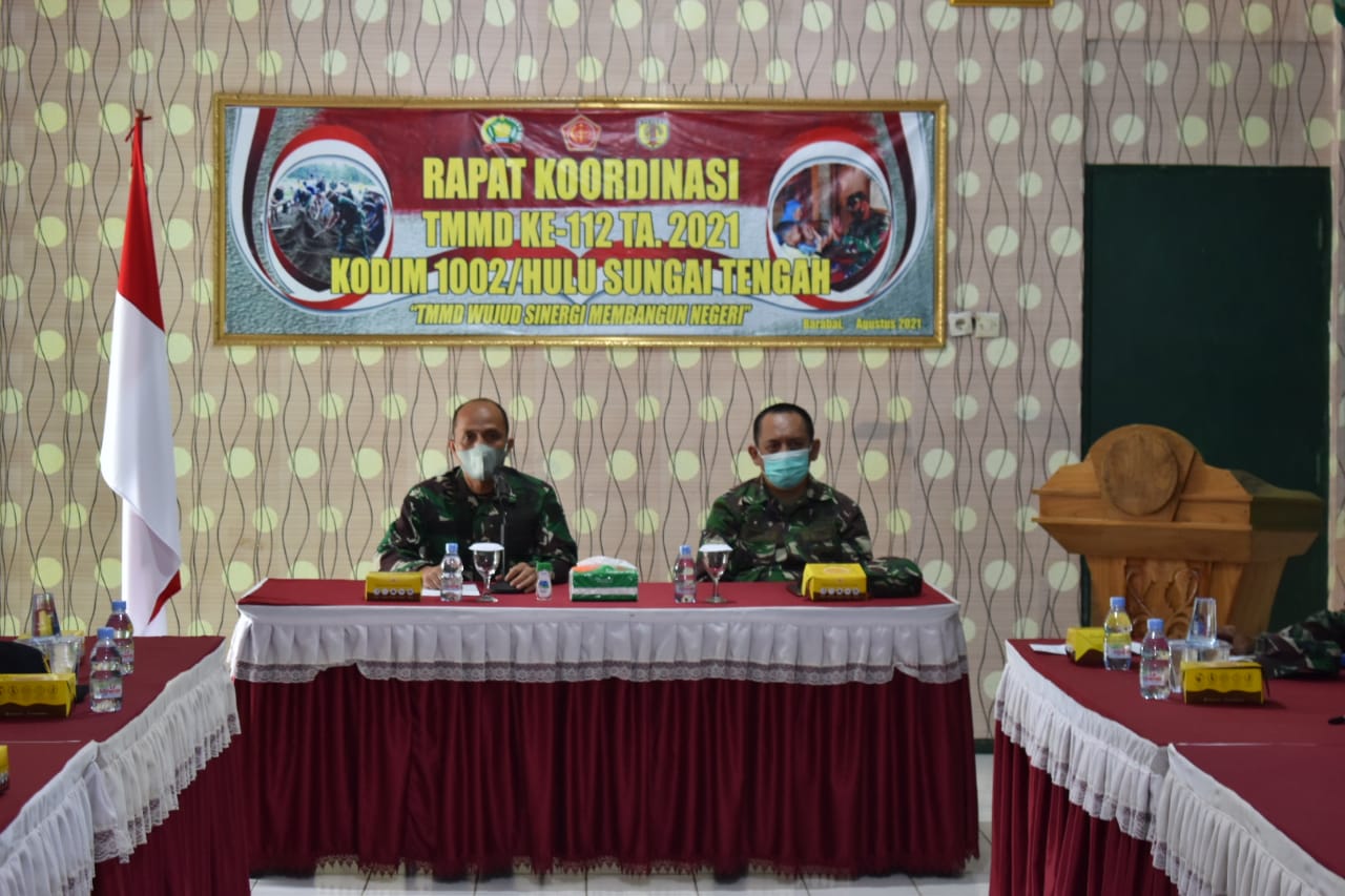 Rapat koordinasi diikuti oleh Kepala Staf Kodim 1002/HST, Danramil dan Perwira Staf Kodim 1002/HST serta seluruh intansi Pemerintahan Kab. Hulu Sungai Tengah yang terlibat dalam pelaksanaan kegiatan TNI Manunggal Membangun Desa ke-112 tahun 2021 di wilayah Kodim 1002/HST yang akan dibuka pada tanggal 15 September 2021.