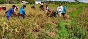 BARABAI-Danpos Koramil 1002-02/Ilung Peltu Riyanto bersama anggota Koptu Andiana melaksanakan panen raya bersama kelompok tani Mekar Tani desa Limpasu Kecamatan Limpasu Kabupaten Hulu Sungai Tengah (HST). Kamis (15/4).