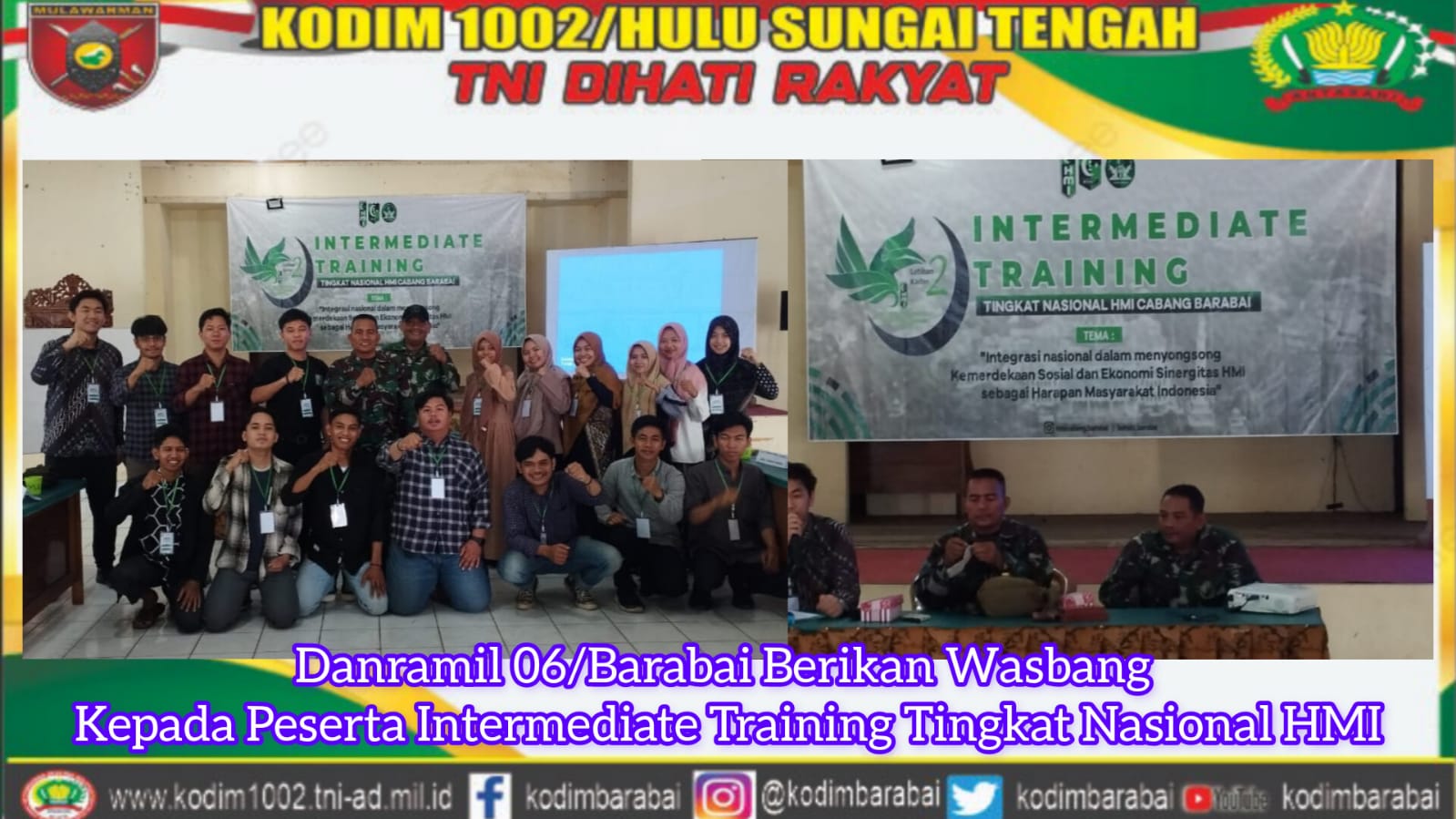 Danramil 06/Barabai Berikan Wasbang Intermediate Training Tingkat Nasional HMI Cabang Barabai dalam Intermediate Training Tingkat Nasional HMI Cabang Barabai, bertempat di Gedung Juang Jl.Bintara No 07 Kec. Barabai Kab. Hulu Sungai Tengah.Senin (18/09/2023).