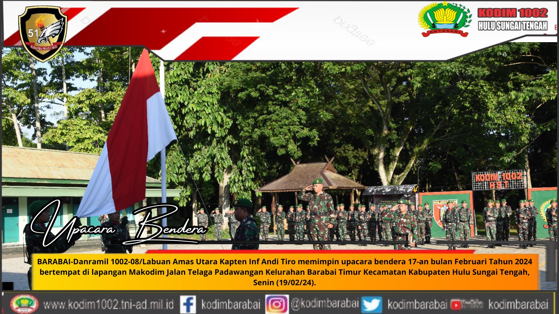 BARABAI-Danramil 1002-08/Labuan Amas Utara Kapten Inf Andi Tiro memimpin upacara bendera 17-an bulan Februari Tahun 2024 bertempat di lapangan Makodim Jalan Telaga Padawangan Kelurahan Barabai Timur Kecamatan Kabupaten Hulu Sungai Tengah, Senin (19/02/24).