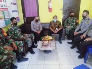BARABAI-Danramil 1002-01/BAS Kapten Inf Subhan bersama anggota koramil dan Camat BAS Kartadipura mendatangi mapolsek Batang Alai Selatan untuk memberikan surprise dan ucapan HUT Bhayangkara ke-75 tahun 2021. Kamis (01/07).