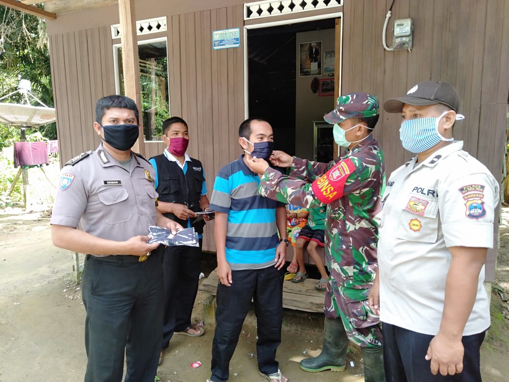 BARABAI-Babinsa Koramil 1002-07/Pagat Serda Sapto, Bhabinkamtibmas dan aparatur kecamatan Hantakan melakukan pembagian masker gratis kepada warga masyarakat desa Kindingan kecamatan Hantakan Kabupaten Hulu Sungai Tengah (HST).Senin (07/12).