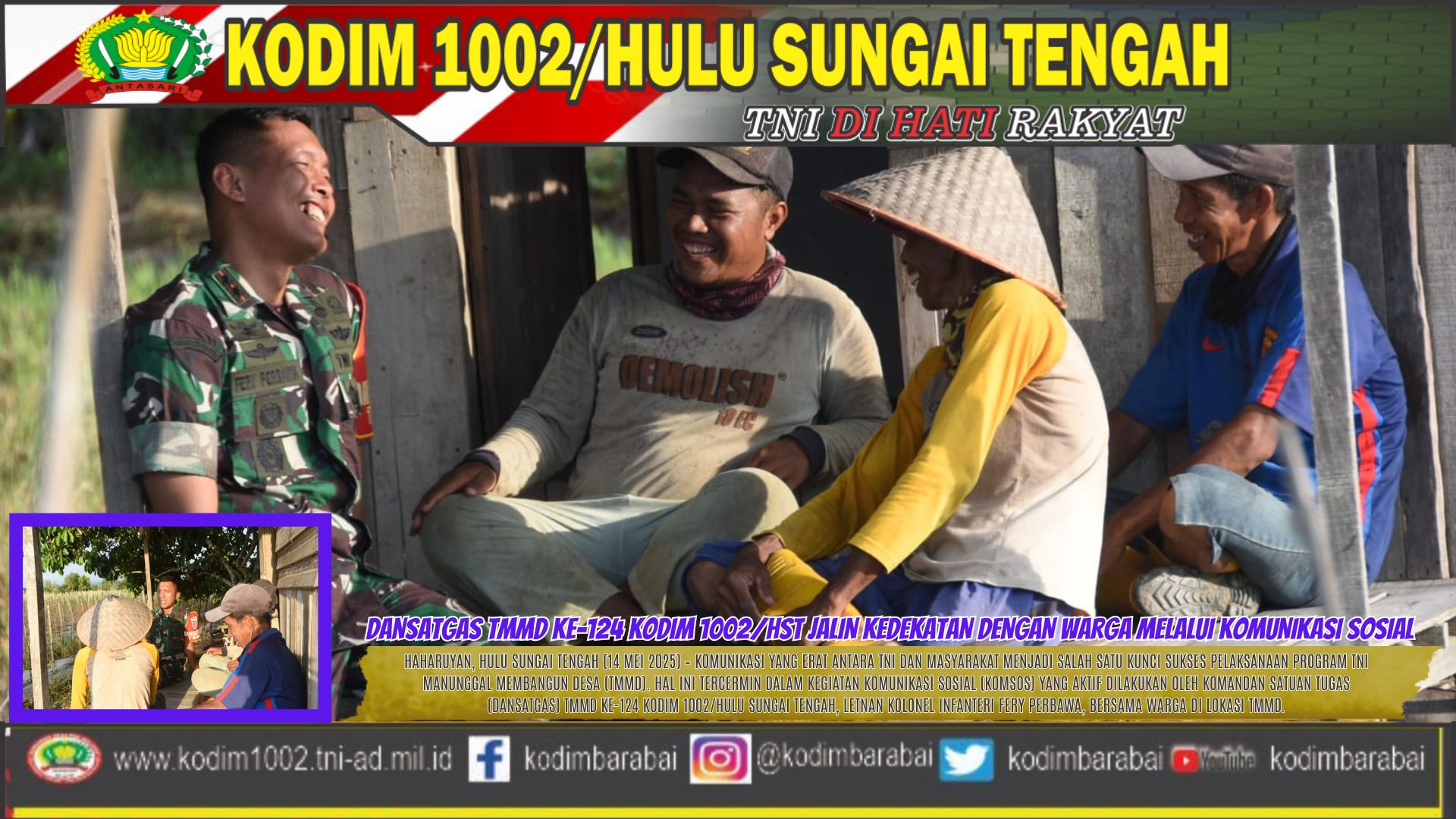 HARUYAN, HULU SUNGAI TENGAH (14 Mei 2025) – Komunikasi yang erat antara TNI dan masyarakat menjadi salah satu kunci sukses pelaksanaan program TNI Manunggal Membangun Desa (TMMD). Hal ini tercermin dalam kegiatan Komunikasi Sosial (Komsos) yang aktif dilakukan oleh Komandan Satuan Tugas (Dansatgas) TMMD ke-124 Kodim 1002/Hulu Sungai Tengah, Letnan Kolonel Infanteri Fery Perbawa, bersama warga di lokasi TMMD.