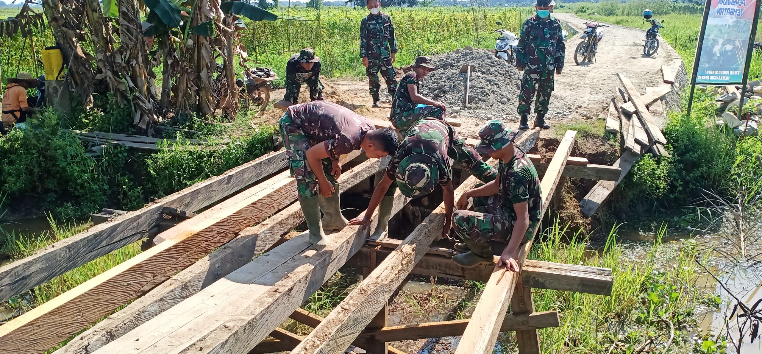 BARABAI-Tidak menunggu lama-lama, Satgas TNI Manunggal Membangun Desa (TMMD) Ke-112 Kodim 1002/Hulu Sungai Tengah (HST) langsung perbaiki jembatan sasaran Fisik tambahan.