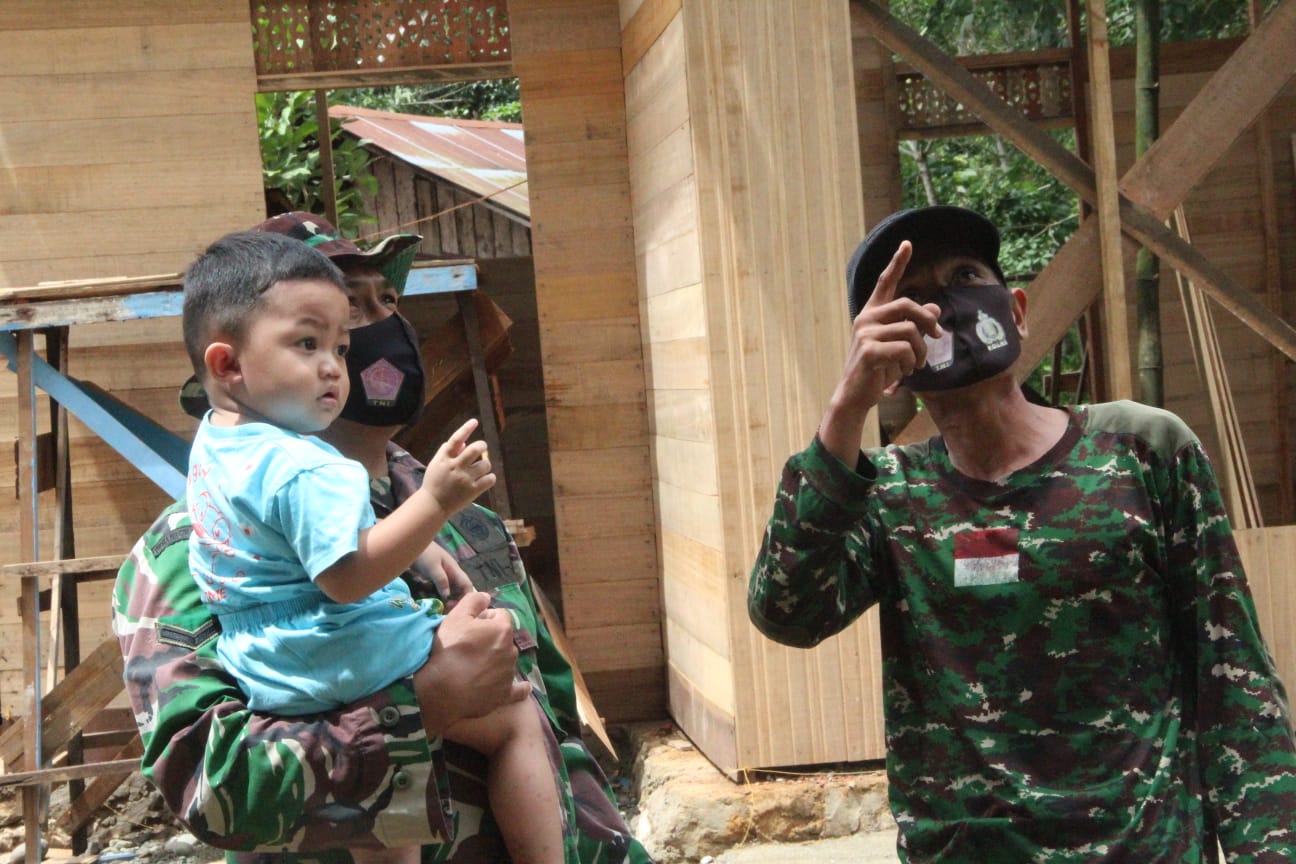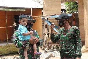 HULU SUNGAI TENGAH- Di tengah kesibukan sehari-hari dalam perbaikan mutu jalan serta sasaran lain di Desa Rantau Keminting, Kecamatan Labuan Amas Utara, anggota Satgas TMMD Kodim 1002/Hulu Sungau Tengah (HST) mendekatkan diri dengan berbagai kalangan masyarakat setempat diantaranya dengan anak-anak desa setempat.