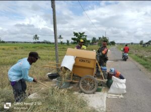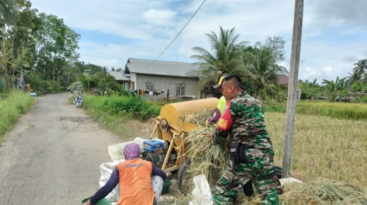 BARABAI-Koptu Rubi Irawan Babinsa Koramil 1002-01/Batang Alai Selatan membantu warga binaan Merontok Padi.
