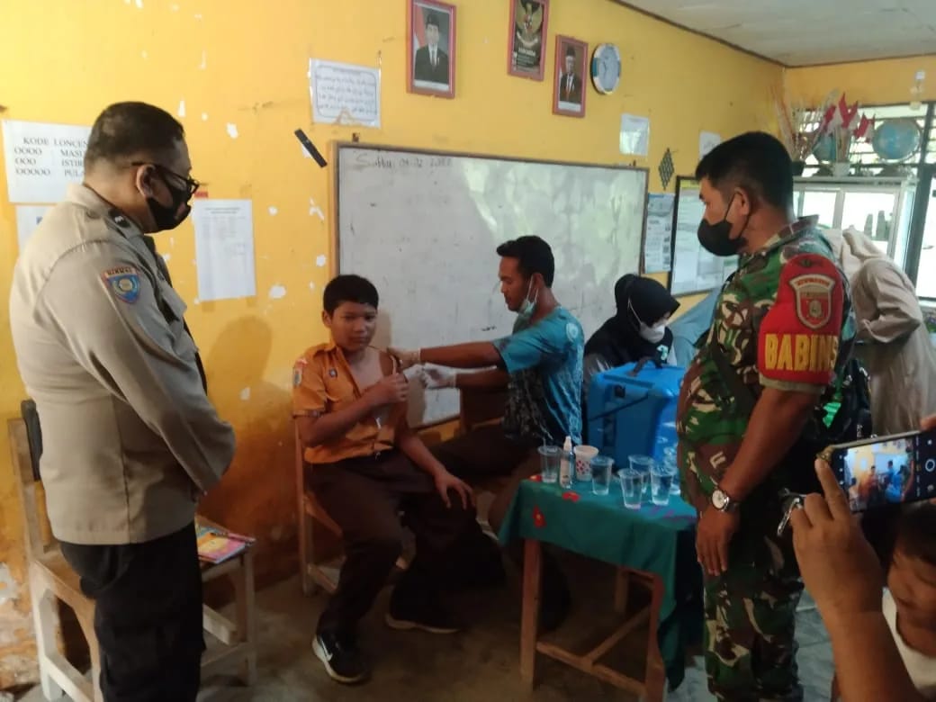 Salah satu upaya tersebut dengan melakukan pendampingan Vaksinasi anak yang dilakukan oleh Serda Tajuddin Babinsa Koramil 1002-07/Batu Benawa bersama Bhabinkamtibmas di SDN Aluan Besar Kecamatan Batu Benawa Kabupaten Hulu Sungai Tengah (HST) Kalimantan Selatan.Sabtu (05/02).
