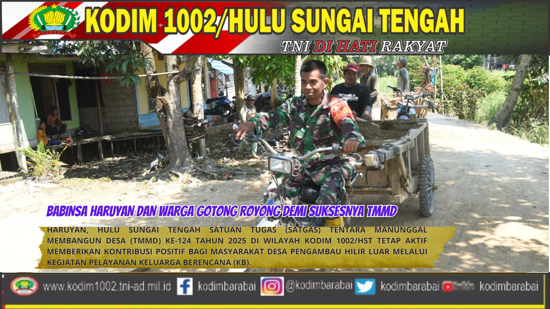 HARUYAN, HULU SUNGAI TENGAH –Kebersamaan dan gotong royong antara TNI dan masyarakat kembali terlihat dalam pelaksanaan Program TNI Manunggal Membangun Desa (TMMD) ke-124 tahun 2025 wilayah Kodim 1002/Hulu Sungai Tengah.