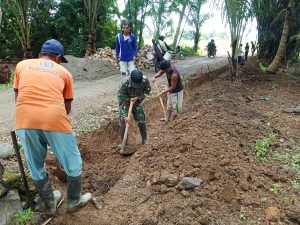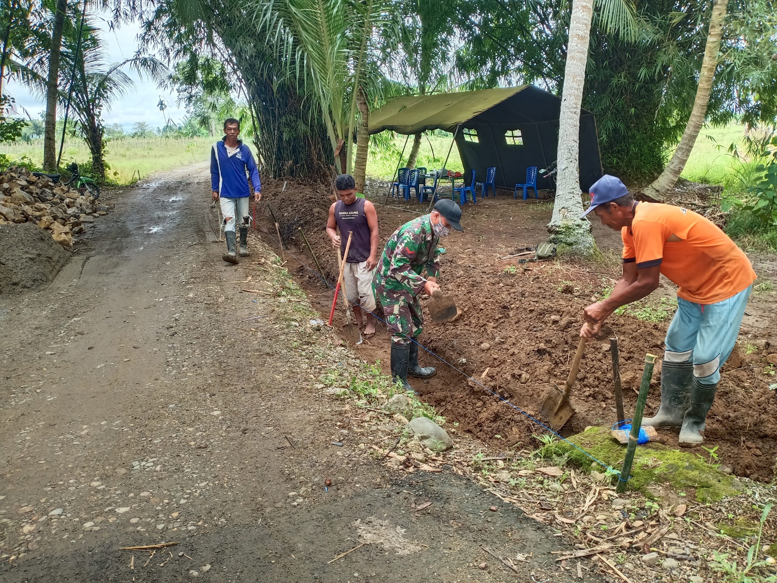 Bahu membahu TNI Takyat berbaur melaksanakan pembuatan siring/pondasi badan jalan dengan penuh suka cita.