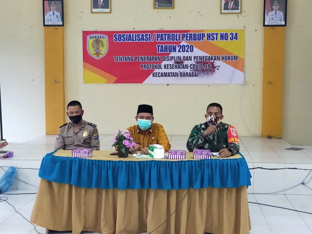 Turut hadir dalam Sosialisasi/Patroli Perbub HST no 34 tahun 2020 tentang Penerapan Disiplin dan Penegakkan Hukum Protokol Kesehata antara lain; Camat Barabai, Danramil 1002-06/Barabai, Kepala BPBD HST, Kabag Hukum Setda HST, Anggota Binmas Polres HST, Kepala Puskesmas Barabai dan Tokoh agama se-kecamatan Barabai.(pendim1002).