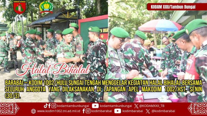 BARABAI – Kodim 1002/Hulu Sungai Tengah menggelar kegiatan Halal Bihalal bersama seluruh anggota yang dilaksanakan di lapangan apel Makodim 1002/HST, Senin (30/3).