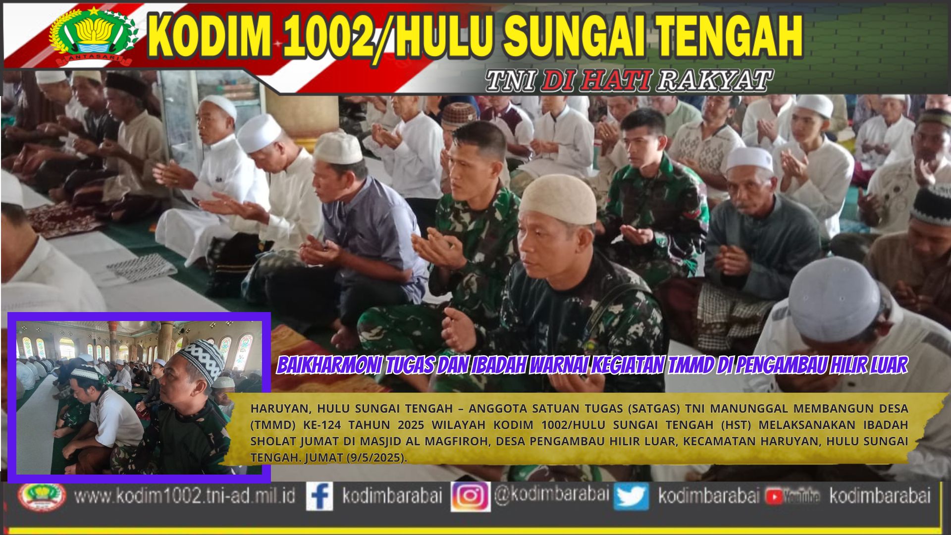 HARUYAN, HULU SUNGAI TENGAH – Anggota Satuan Tugas (Satgas) TNI Manunggal Membangun Desa (TMMD) ke-124 tahun 2025 wilayah Kodim 1002/Hulu Sungai Tengah (HST) melaksanakan ibadah sholat Jumat di Masjid Al Magfiroh, Desa Pengambau Hilir Luar, Kecamatan Haruyan, Hulu Sungai Tengah. Jumat (9/5/2025).