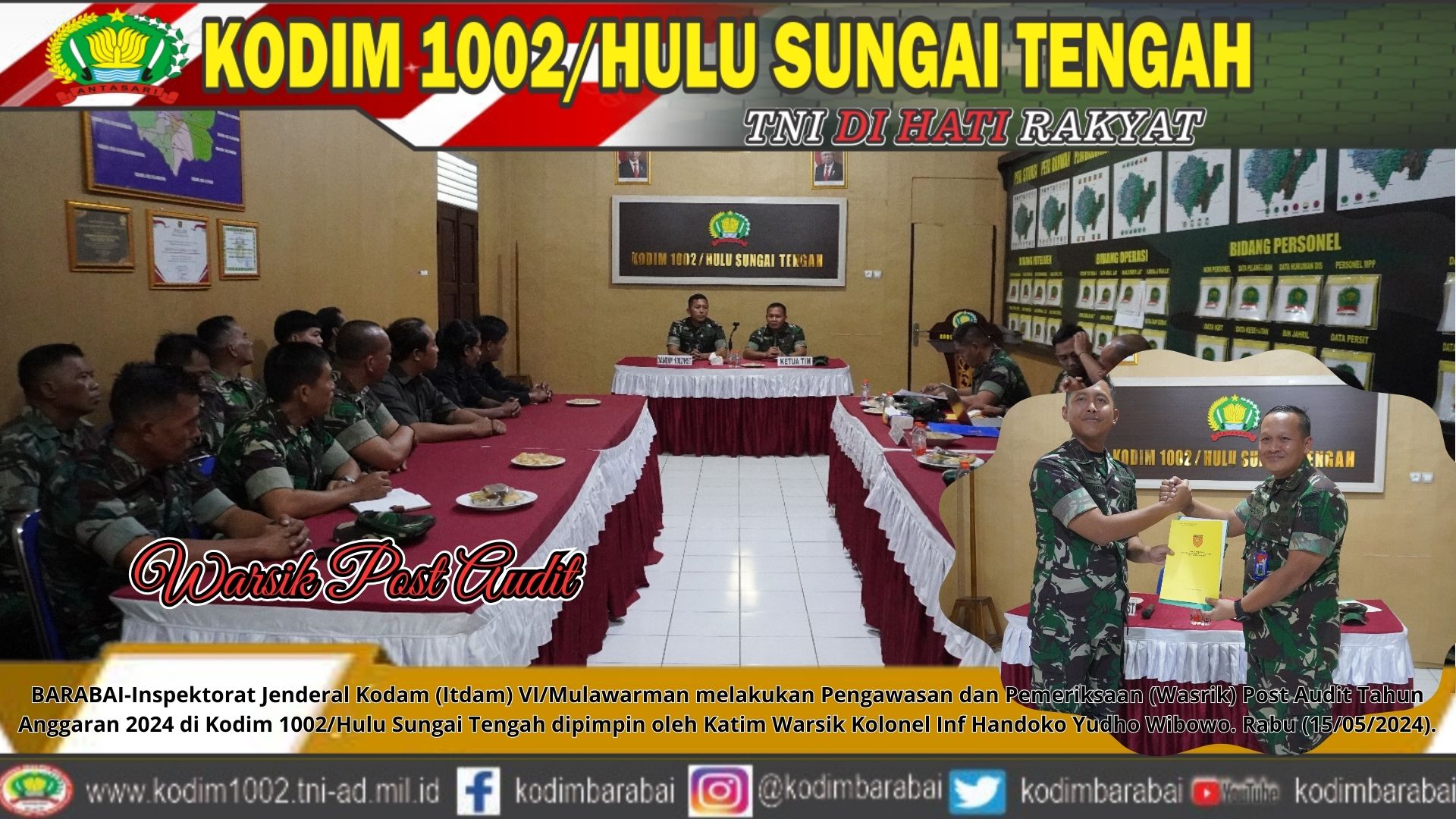 Post Audit Itdam VI/Mulawarman untuk memastikan pelaksanaan kegiatan satuan Kodim 1002/HST dalam bidang program kerja dan anggaran sudah berjalan dengan tertib dan telah mempedomani program yang telah ditetapkan dan koridor peraturan perundangan yang berlaku, guna mencegah terjadinya penyimpangan,
