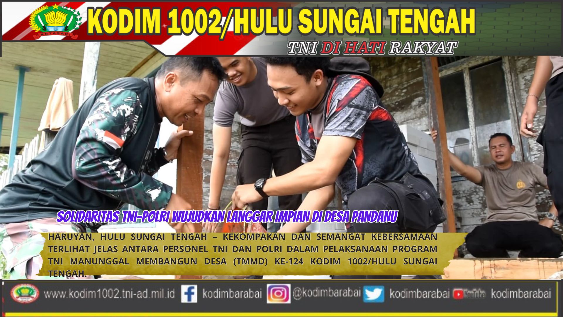 Sinergi yangSoliditas TNI-Polri ini tampak nyata dalam pengerjaan rehabilitasi Langgar Darussalam yang berlokasi di RT 03 RW 02 Desa Pandanu, Kecamatan Haruyan. Jumat, 9 Mei 2025.