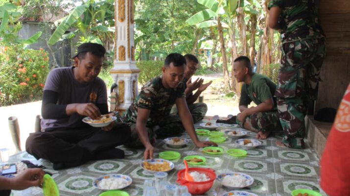 Anggota Satgas TMMD melaksanakan makan siang bersama-sama warga Desa Mangunang Kecamatan Haruyan Kabupaten Hulu Sungai Tengah. Sabtu (13/05/2023).