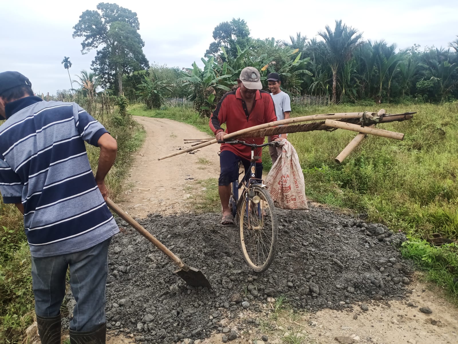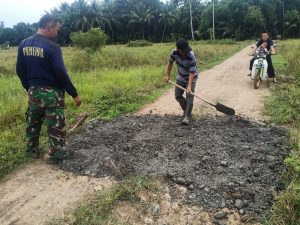 Melihat kondisi jalan Pra TMMD berlubang, salah satu warga desa Rantau Keminting dengan sigap tutup lubang dengan Sirtu (Pasir Batu).