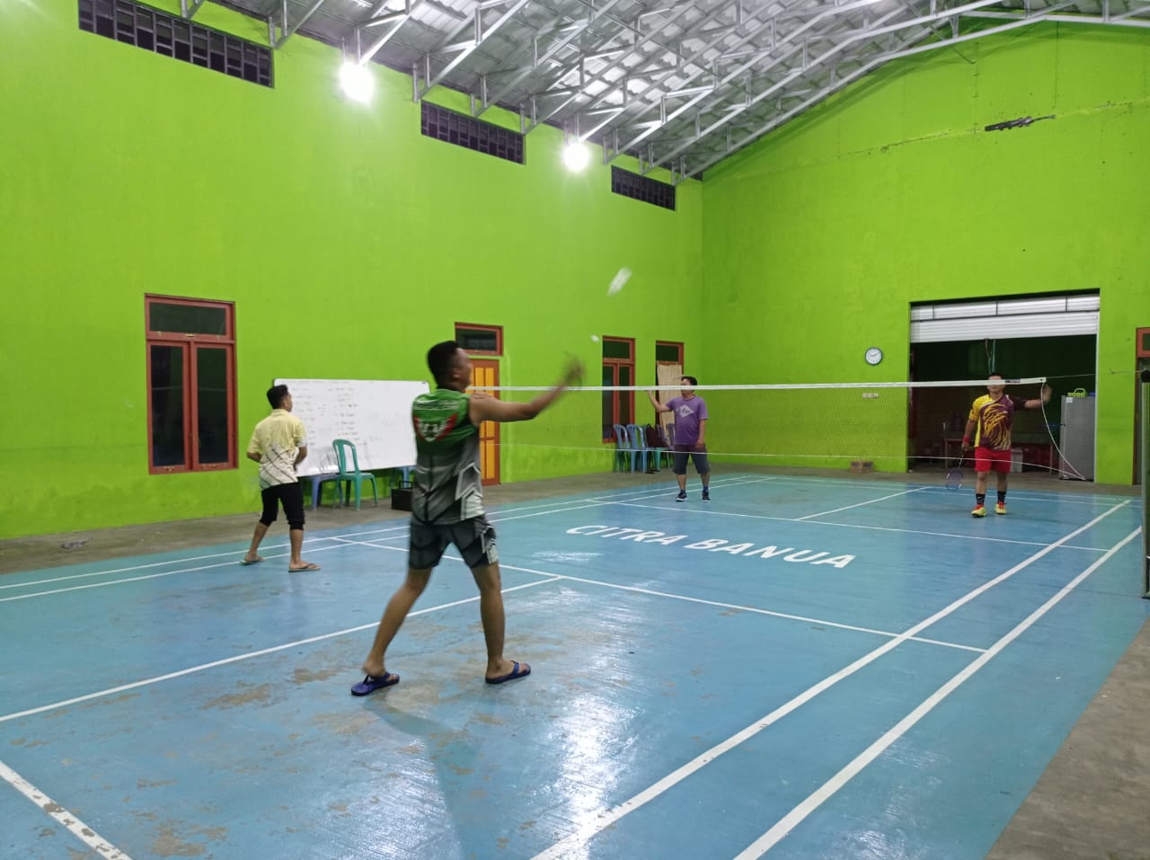 Salah satunya dengan bermain bulu tangkis yang dilakukan oleh Pratu Mansyah anggota Satgas TMMD dari Yonif 621/Manuntung di gedung serbaguna desa Banua Kupang.Senin (04/10/2021) malam
