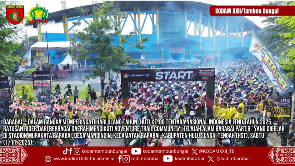 BARABAI – Dalam rangka memperingati Hari Ulang Tahun (HUT) ke-80 Tentara Nasional Indonesia (TNI) tahun 2025, ratusan rider dari berbagai daerah mengikuti Adventure Trail Community “Jelajah Alam Barabai Part 8” yang digelar di Stadion Murakata Barabai, Desa Mandingin, Kecamatan Barabai, Kabupaten Hulu Sungai Tengah (HST), Sabtu (1/11/2025).