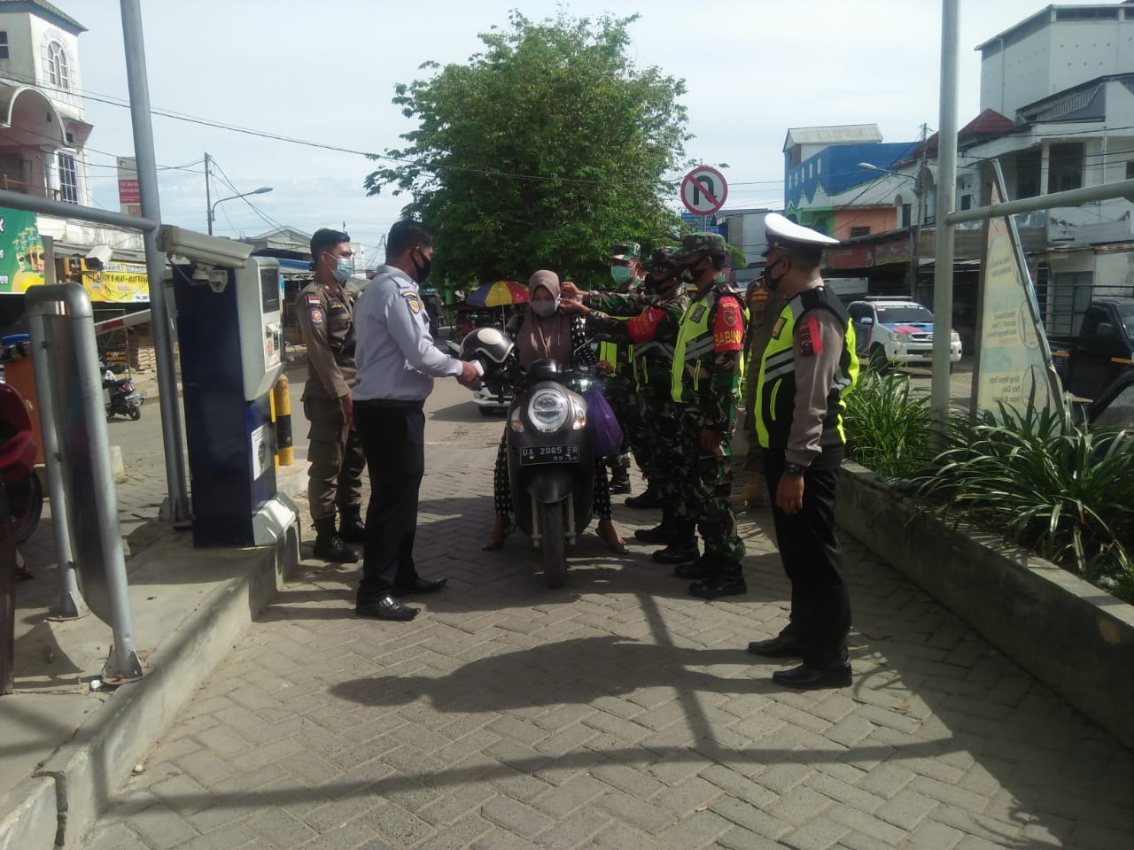 Aparat gabungan melakukan penertiban di portal pintu masuk pasar Agrobisnis untuk mendisiplinkan para pengunjung pasar agar taat pada protokol kesehatan, tak hanya itu para petugas pun berkeliling pasar memberikan himbauan kepada para pedagang dan pengunjung/pembeli agar selalu memakai masker.