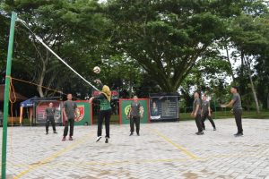 BARABAI-Dalam rangka meningkatkan jalinan Kebersamaan, Anggota Kodim 1002/HST melaksanakan olahraga volly ball dengan Persit Kartika Chandra Kirana Cabang XXV Dim 1002 di lapangan Apel Makodim setempat, Jum’at (10/02).