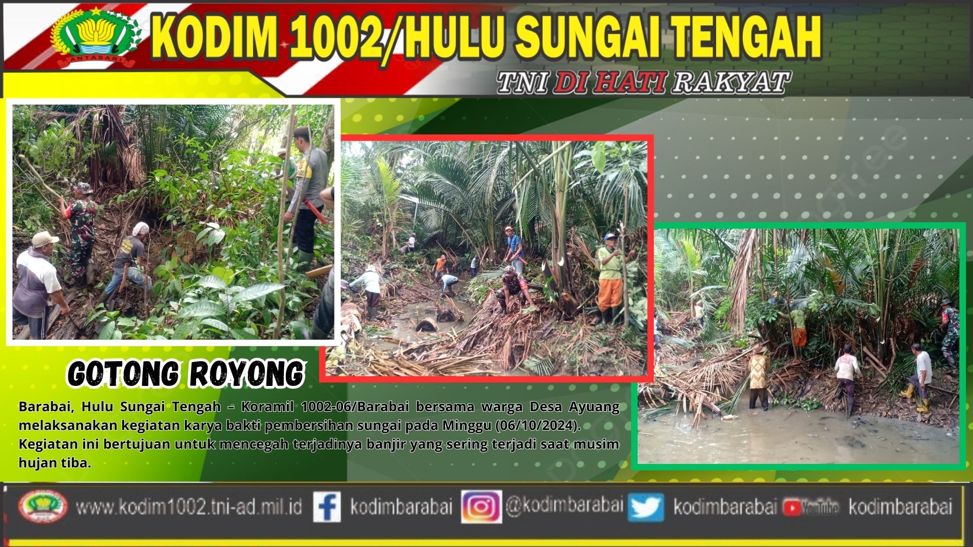 Barabai, Hulu Sungai Tengah – Koramil 1002-06/Barabai bersama warga Desa Ayuang melaksanakan kegiatan karya bakti pembersihan sungai pada Minggu (06/10/2024).