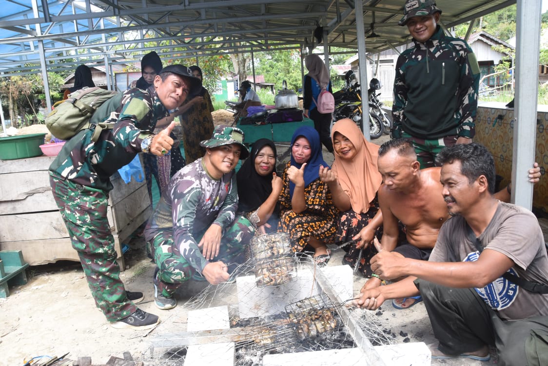 Pemandangan ceria tampak ketika ibu-ibu dan anggota Satgas TNI terlihat asyik membakar ikan secara gotong royong. Aroma ikan bakar yang menggugah selera semakin menambah keakraban di antara mereka.