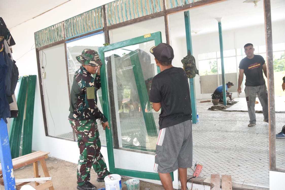 Terlihat anggota Satuan Tugas (Satgas) TMMD tengah fokus pada pekerjaan rehabilitasi Langgar Darussalam. Mereka tampak sedang memasang Jendela. Rabu (28/5).