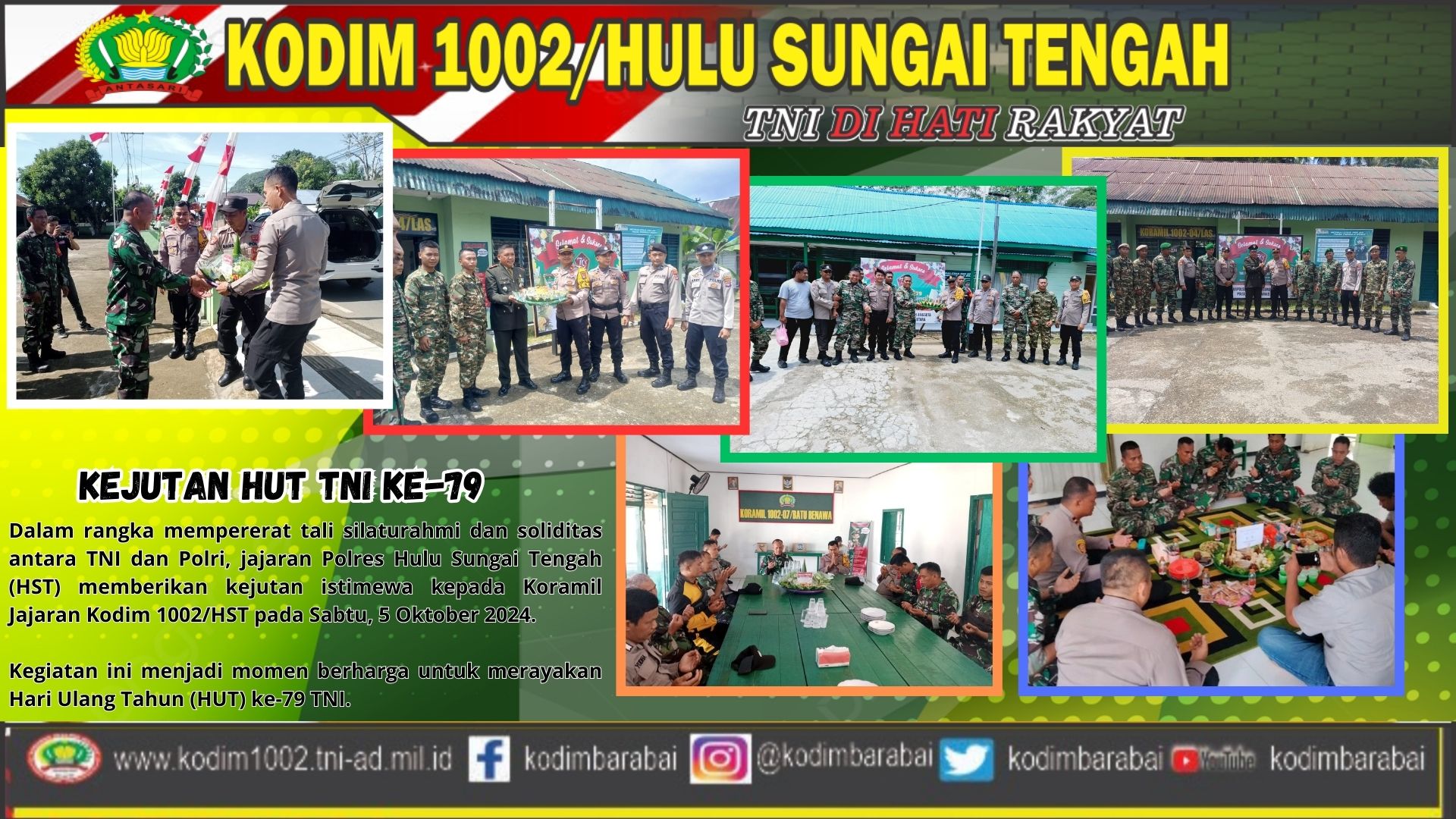 Dandim 1002/HST, Letkol Inf Feri Perbawa S.Hub.Int., M.Han, melalui Kepala Staf Kodim 1002/HST, Mayor Inf Moh. Alip Suroso, mengungkapkan rasa bangga dan syukur atas momen ini. “Di usianya yang ke-79, TNI semakin dicintai rakyat,” ujarnya.