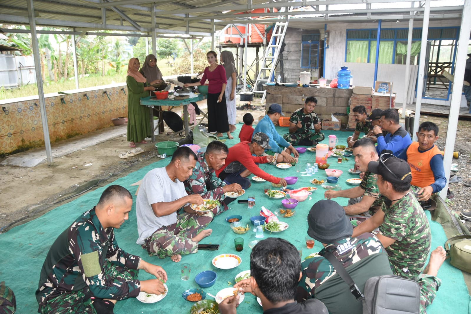 Haruyan, Hulu Sungai Tengah – Suasana makan siang di lokasi rehab Langgar Darussalam pada Kamis (22/5) terasa berbeda dan penuh kehangatan. Kali ini, para anggota Satuan Tugas (Satgas) TNI Manunggal Membangun Desa (TMMD) ke-124 Kodim 1002/Hulu Sungai Tengah (HST) disambut dengan menu makan siang istimewa berupa lalapan, yang disiapkan dengan penuh semangat oleh ibu-ibu warga setempat.