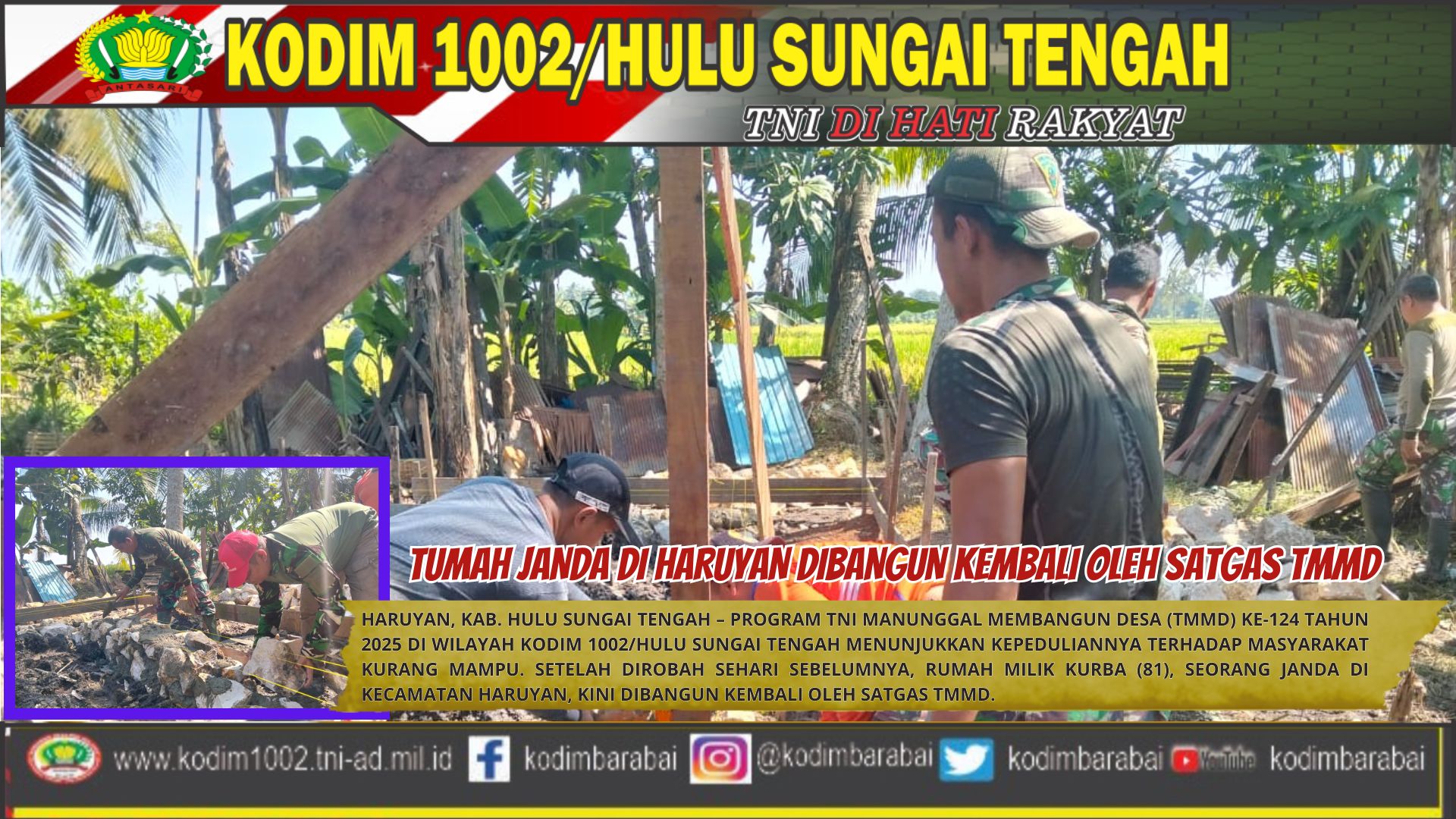 HARUYAN, KAB. HULU SUNGAI TENGAH – Program TNI Manunggal Membangun Desa (TMMD) ke-124 tahun 2025 di wilayah Kodim 1002/Hulu Sungai Tengah menunjukkan kepeduliannya terhadap masyarakat kurang mampu. Setelah dirobah sehari sebelumnya, rumah milik Kurba (81), seorang janda di Kecamatan Haruyan, kini dibangun kembali oleh Satgas TMMD.