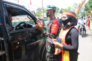 BARABAI-Kodim 1002/Barabai barsama siswa siswi anak SLTA kab HST seusai melaksanakan komsos kreatif pagelaran tari kreasi Daerah Kalimanatan melakukan pembagian masker kepada masyarakat di Jalan Padawangan depan Makodim 1002/Barabai.Kamis (27/8).