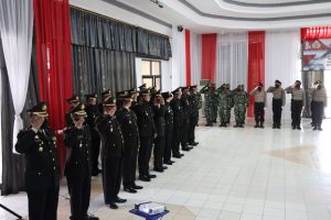 BARABAI-Kepala Staf Kodim 1002HST Mayor Arm Agus Sutisna bersama anggota mengikuti Upacara Peringatan HUT Bhayangkara Ke-76 Tahun 2022 Polres HST Secara Virtual Yang dipimpin oleh Presiden RI Ir. H. Joko Widodo berlangsung di Pendopo Bupati HST Jalan Perwira No. 01 Barabai. Selasa (05/07).