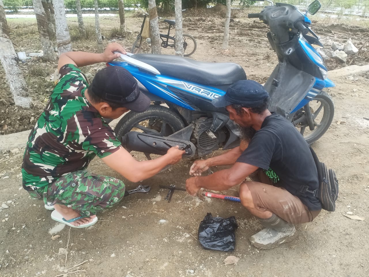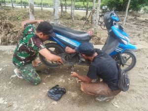 Kepedulian Satgas TMMD HST saat Melihat Warga Membetulkan Kendaraan Roda Dua