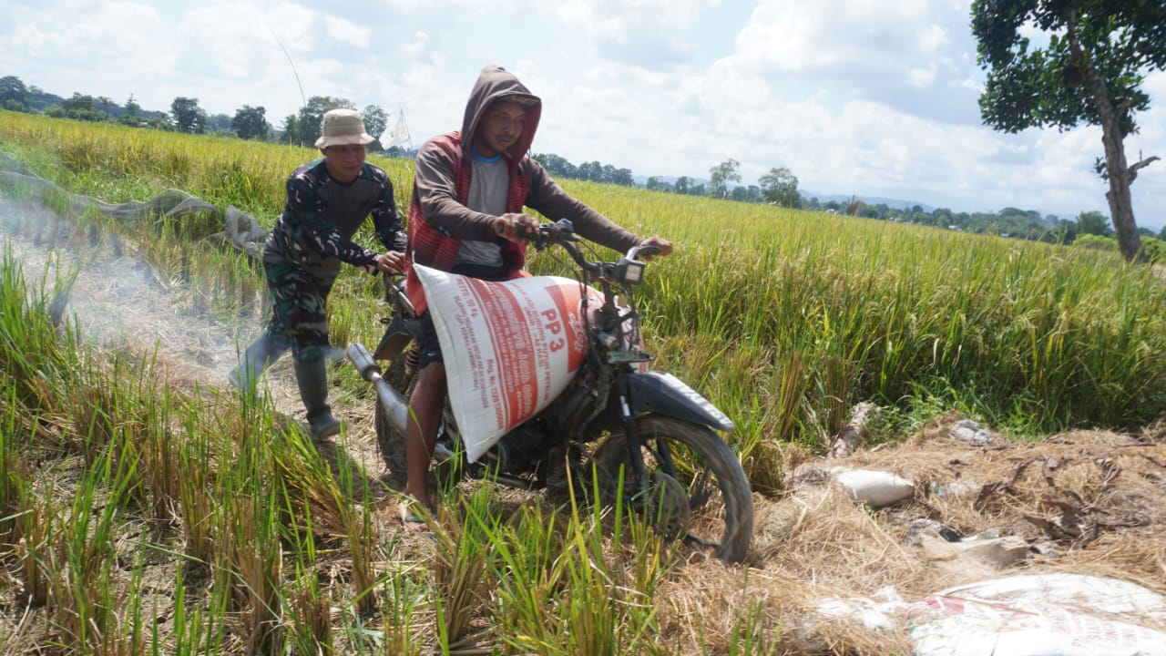 Aksi nyata ini terlihat ketika salah satu anggota Satgas, Koptu Rominjus, membantu seorang petani mendorong sepeda motor yang mengangkut padi hasil panen di Haruyan, Hulu Sungai Tengah pada Selasa (13/05).