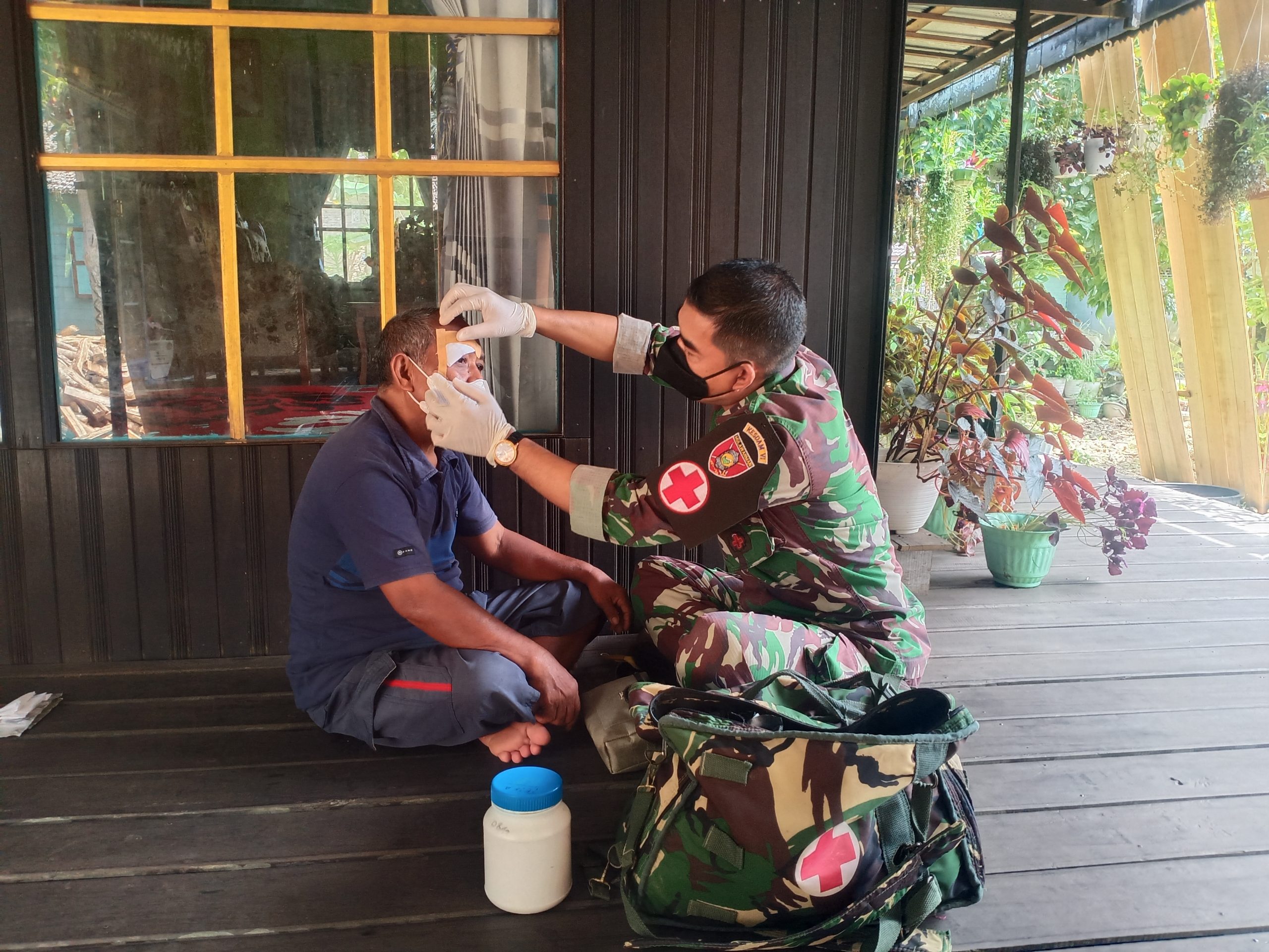 Seperti yang dilakukan oleh Serka Abdurahman salah satu anggota Satgas TMMD ke-112 tahun 2021 Kodim 1002/HST memberikan pengobatan secara gratis kepada bapak Burhanudin yang terluka akibat kawat payung yang tersangkut di dekat mata sebelah kanan atas.Sabtu (18/09/2021) sore