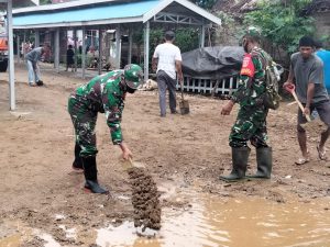 Kodim 1002/Barabai melalui Kepala Staf Mayor Arm Agus Sutisna didampingi Plh.Danramil 1002-03/Haruyan Peltu Henri Murpianto membantu evakuasi warga dan pasca banjir melakukan pembersihan fasilitas umum, tempat ibadah dan rumah warga.Jum’at (14/05).